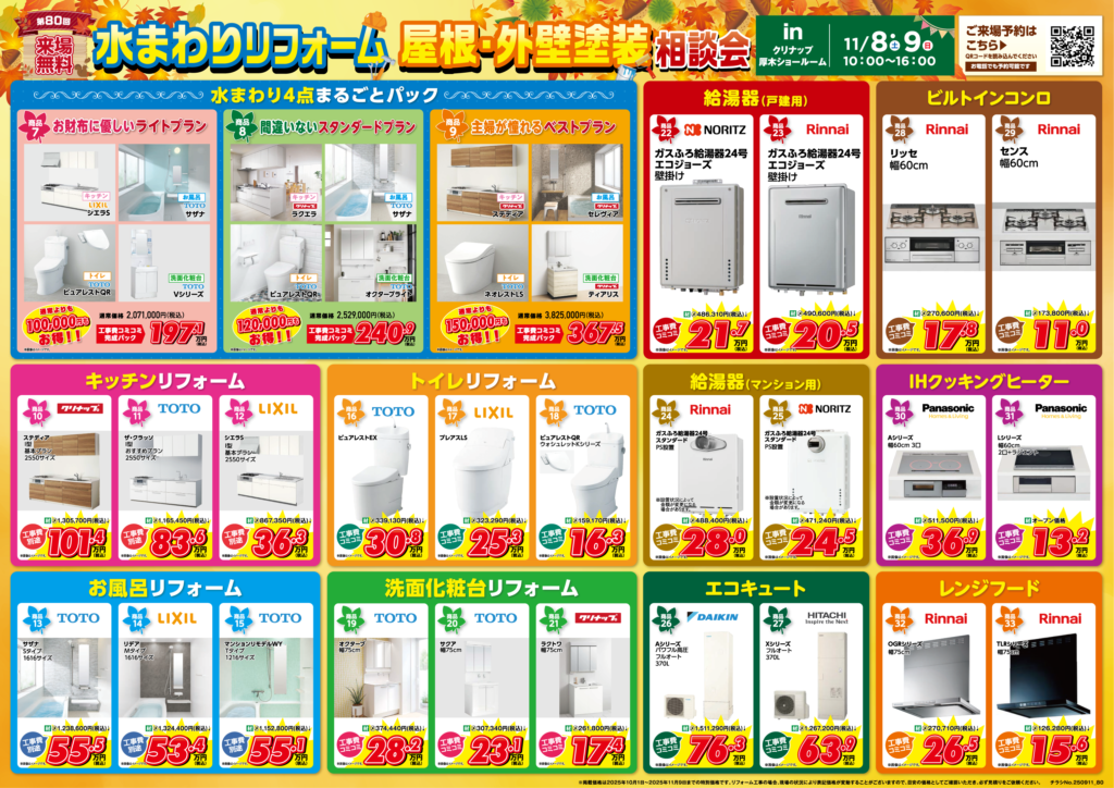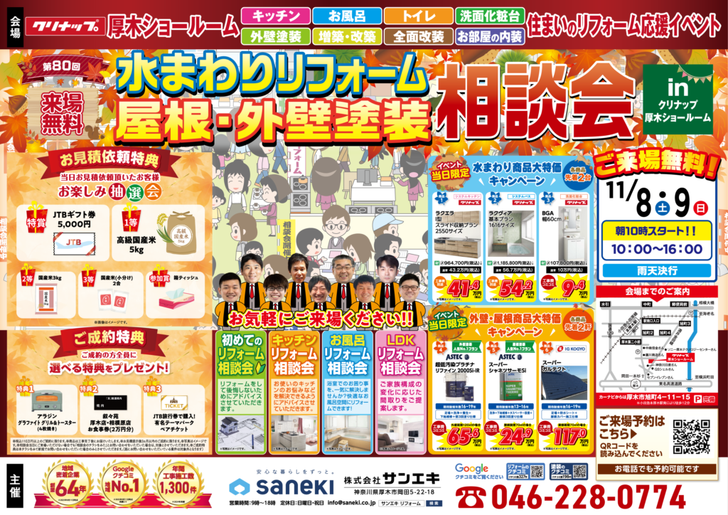 第80回 リフォーム相談会を11/8(土)・9(日)に開催します 2025/10/01 イベント情報 株式会社サンエキは、2025/11/8(土)・9(日)の2日間限定で、水まわりや外壁塗装・屋根リフォームに関する相談会イベントをクリナップ厚木ショーショームにて開催いたします。 詳細は以下をご覧ください!https://saneki.co.jp/20250214/300021628